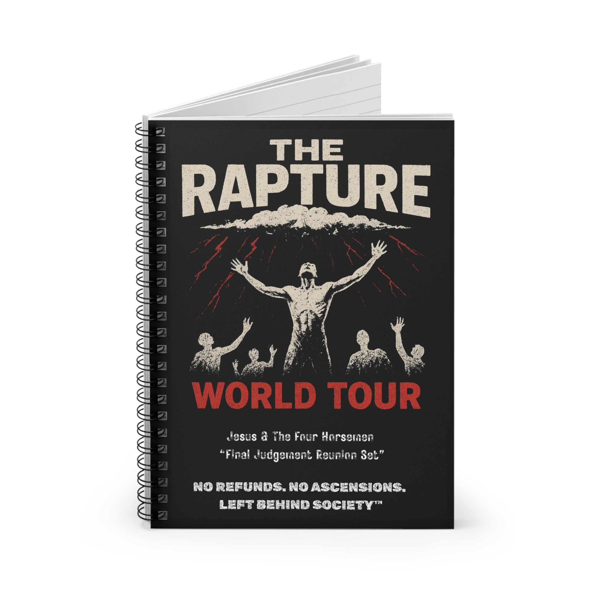 The End Times Tour Notebook carries the same design as the tee—every failed rapture date and the parody opening acts (Jesus & The Four Horsemen, Elvis (Hologram), The Mayan Calendar, Nostradamus). Perfect for recording your predictions, apocalyptic dreams, or just your to-do list while you wait for the next cosmic reschedule.