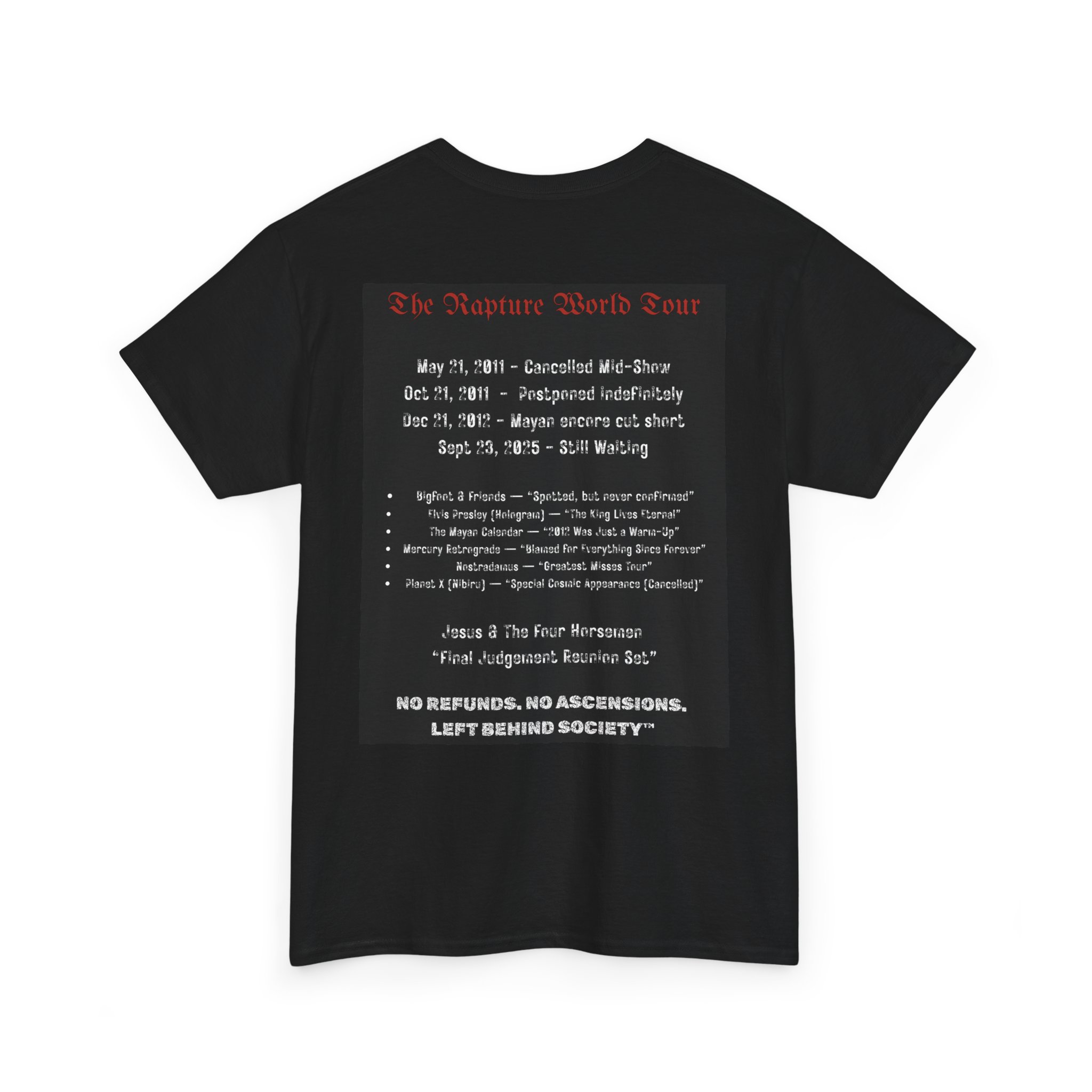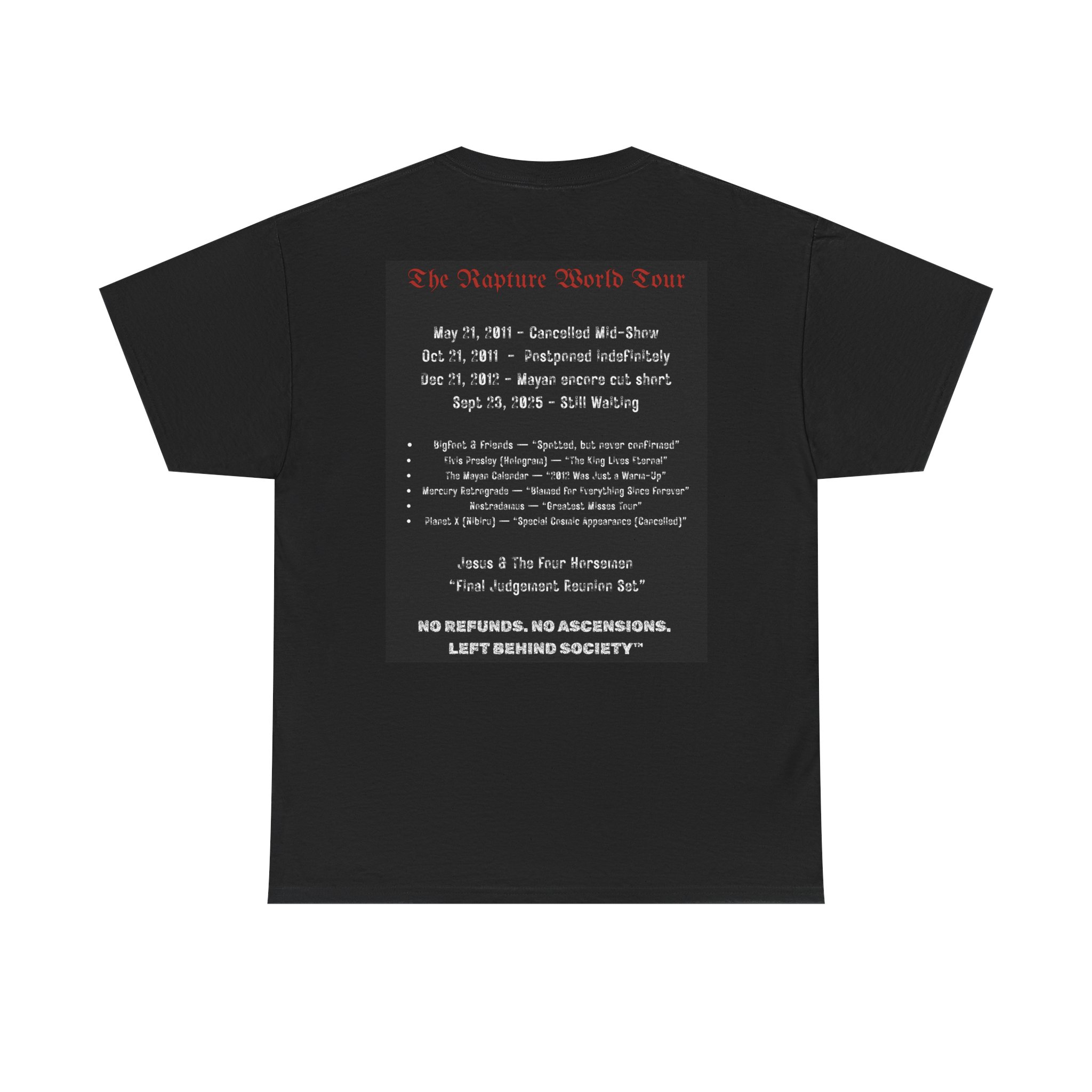This tee is your backstage pass to the apocalypse that never showed. Styled like a vintage rock tour tee, the End Times Tour Shirt immortalizes every failed rapture prediction: